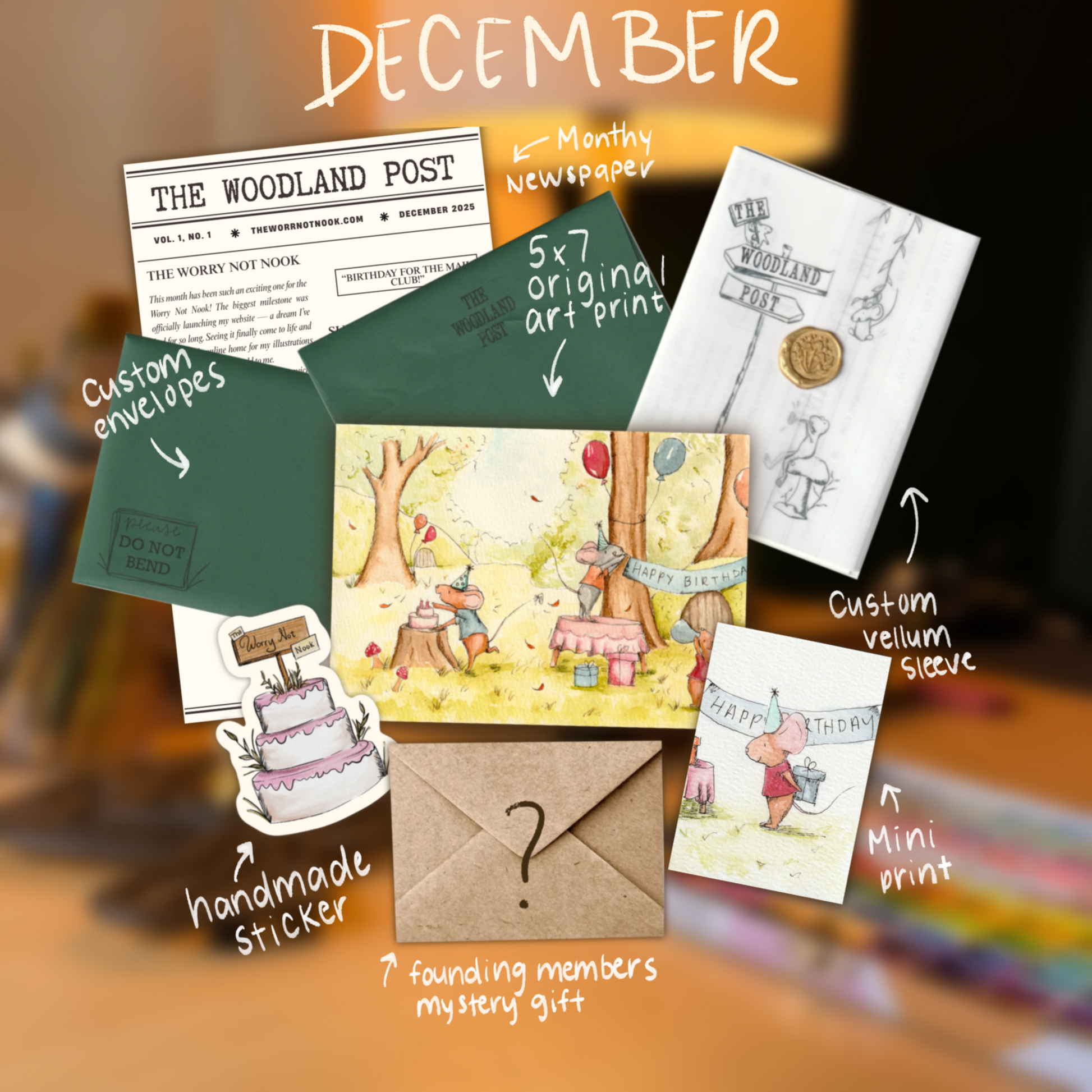A monthly art mail club where an envelope of whimsical watercolor illustrations and little surprises arrives at your mailbox each month—each edition ships out on the 15th of the month (February’s edition will be mailed on the 17th due to the weekend and a holiday).